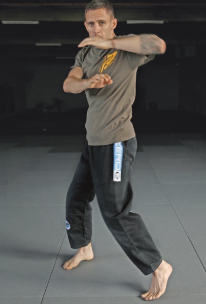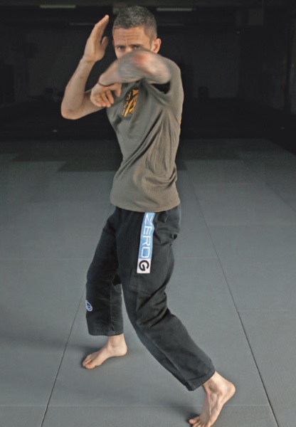 Продолжайте бить/рубить по мишени локтем и вынесите заднюю стопу вперед – перенос веса естественным образом потянет ее за собой. С этого момента можно разворачиваться обратно, или выбросив задний локоть задней руки, или сделав удар предплечьем/кулаком-молотом левой руки. Даже если вы как следует попали в цель, не думайте, что бой на этом закончится – атакующий может находиться под воздействием наркотиков, адреналина и т.п., что делает людей в какой-то мере нечувствительными к боли.