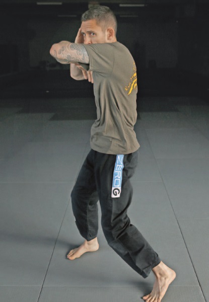 Двигайтесь вперед в направлении мишени, резко оттолкнувшись задней стопой и делая шаг передней. Начните придвигать переднюю руку к груди и поднимите локоть. В это время ваша задняя рука должна подоспеть, чтобы защитить голову.