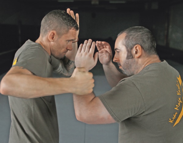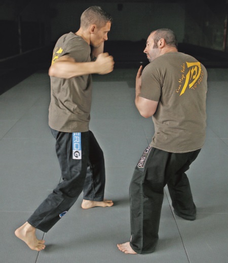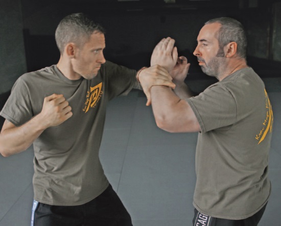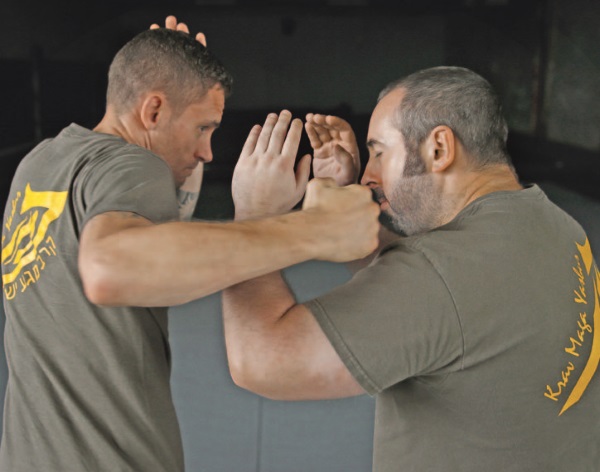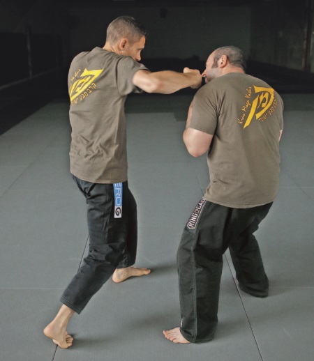 Если вы были развернуты к противнику, ваш локоть должен теперь прийти точно в центральную линию его защиты, т.е. как раз между его рук.