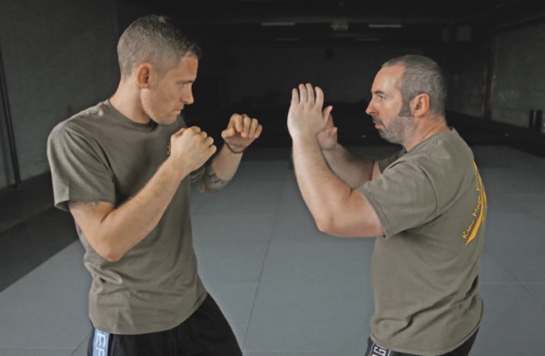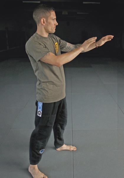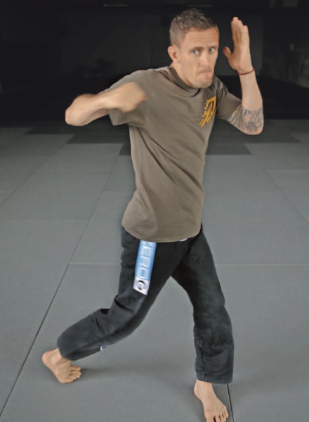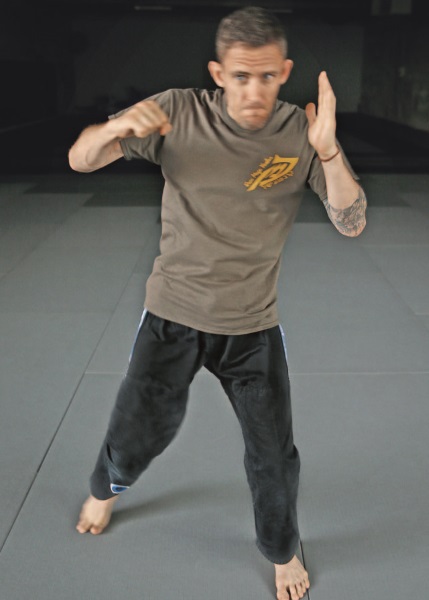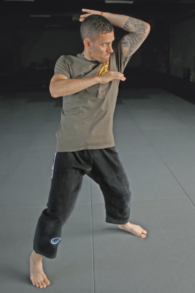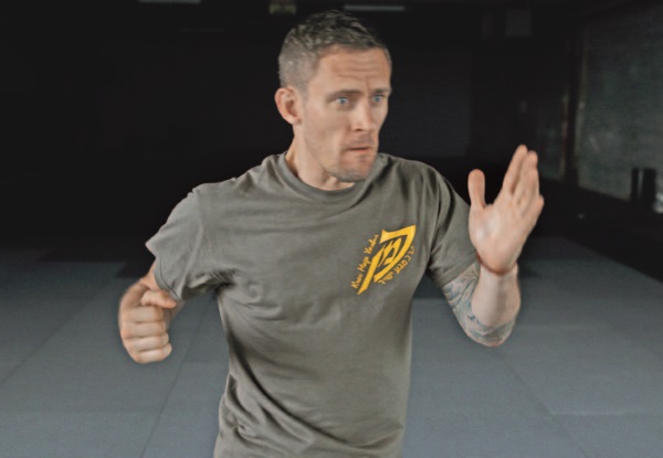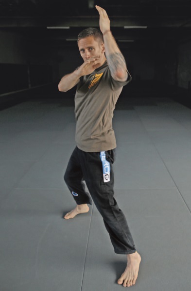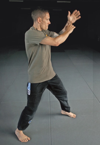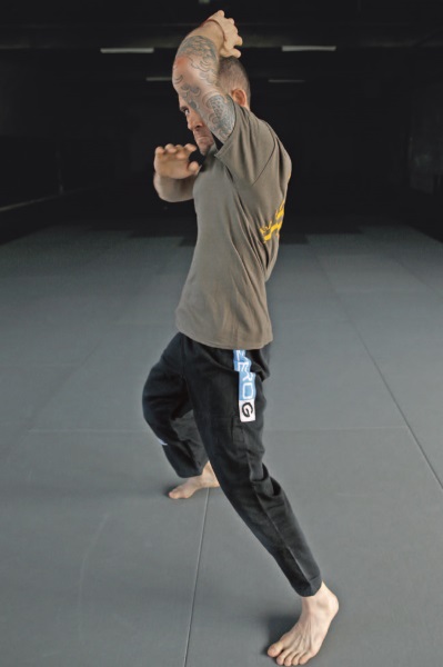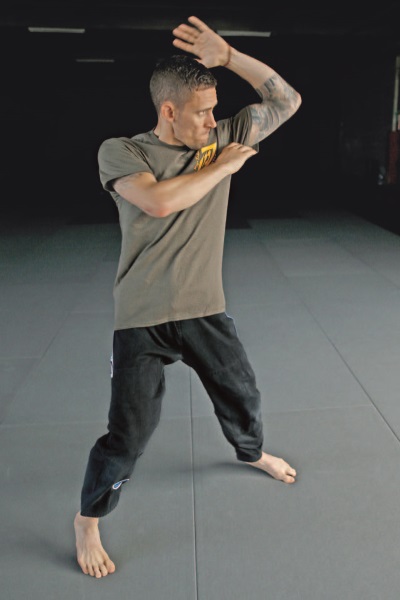 Сделайте шаг/скользящее движение вперед левой ступней, заворачивая руку внутрь, и начните поднимать локоть. Другая рука должна начать движение назад, чтобы вернуться и защитить голову.