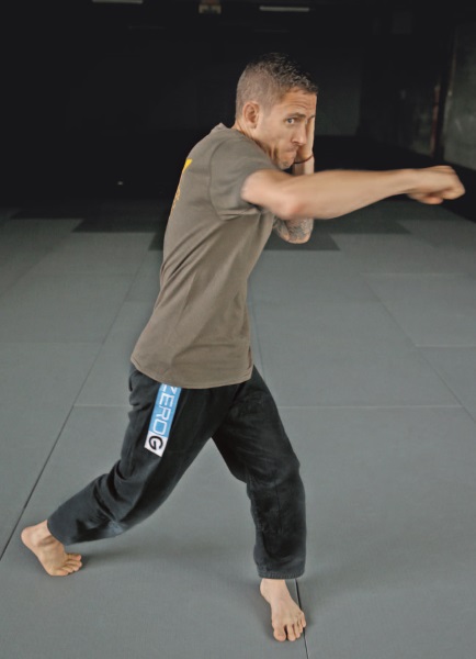 Толкните бедро вперед, поднимите локоть и пятку и сделайте хук в голову.