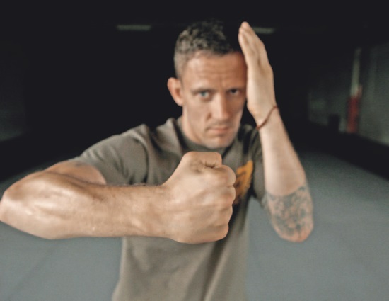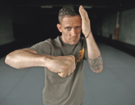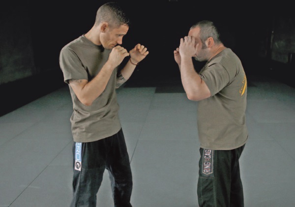 Если противник поднял руки вверх, защищая голову, круговые удары локтями, скорее всего, не будут эффективными. Возможно, будет лучше использовать хук, чтобы обойти защиту соперника.