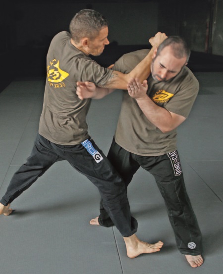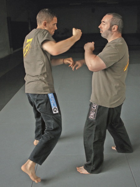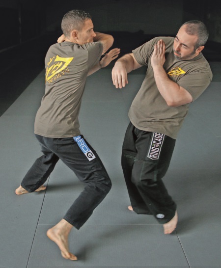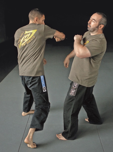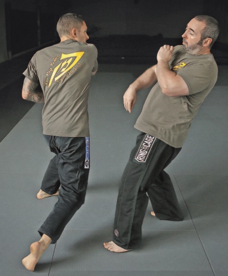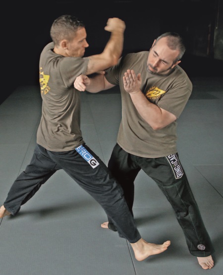 Наружный кулак-молот также может быть проведен в качестве второго удара после хука или удара локтем. Он особенно хорошо работает, если был промах одним из этих ближних ударов – или из-за того, что атакующий отклонил голову назад, или из-за неверной оценки диапазона и расстояния (что может с легкостью произойти в динамической ситуации).