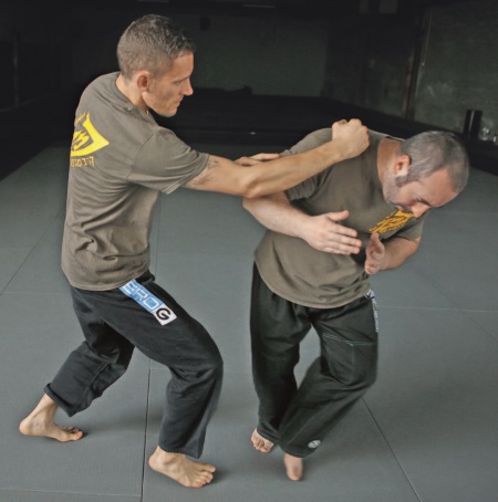 Перенеся вес вперед и сделав шаг, вы продвинетесь в направлении соперника. В это время раскрутите руку от себя, чтобы провести удар предплечьем или кулаком-молотом, в зависимости от расстояния.