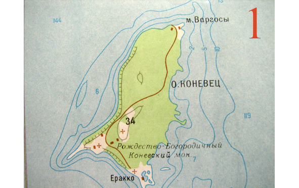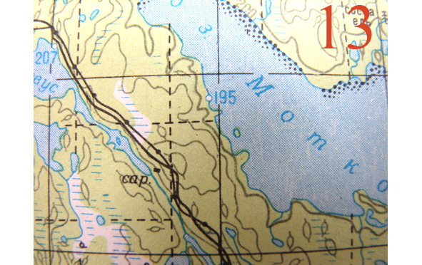 Рельеф местности вообще и рельеф прибрежной полосы в частности может быть определен на крупномасштабных картах при помощи горизонталей. Горизонтали – это кривые замкнутые линии коричневого цвета, соединяющие точки местности с одинаковой высотой над уровнем океана (фото 12). Расстояние по высоте между смежными горизонталями одного склона (ската) называется высотой сечения, а расстояние между горизонталями в плане – заложением. Высота сечения (через сколько метров по высоте проведены сплошные горизонтали), как правило, указывается на карте под линейным масштабом. Горизонтали, от которых ведется отсчет, снабжены отметкой высоты. Чем круче скат, тем меньше заложение и чаще расположены горизонтали, и наоборот. При желании нетрудно по горизонталям прикинуть высоту и крутизну берега. На фото 13 показан высокий и крутой берег оз. Мотко (Карелия), где горизонтали идут близко к линии берега и друг к другу.