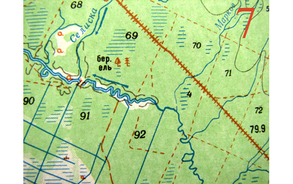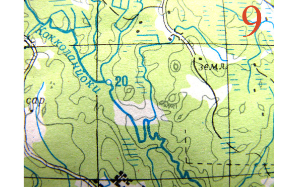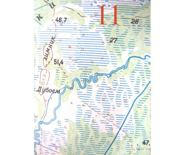 Заболоченные участки местности заштрихованы синими прямыми линиями (фото 11). Непроходимые болота штрихуются непрерывными линиями, а проходимые – прерывистыми. Болота, как известно всем, встречаются и в лесной зоне (зеленый фон), и в безлесной (белый фон). Кстати говоря, на участках леса иногда встречаются значки преобладающих пород деревьев (см. фото 7).