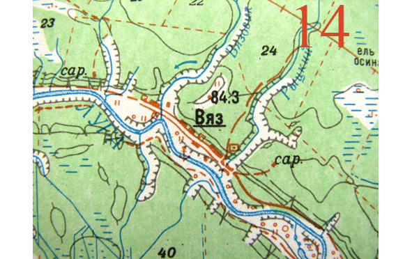Некоторые формы рельефа изображаются особыми условными значками. Обрывы, овраги, ямы, насыпи показываются линией с зубчиками, обращенными в сторону крутого склона. На фото 14 приведено изображение участка реки Луга с обрывистыми берегами.