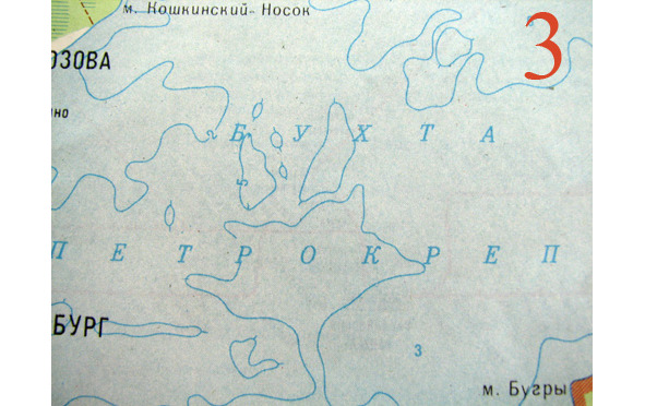 С помощью изобат можно обнаружить также подводные гряды и банки, крупные ямы, рвы и овраги. Эти неоднородности дна, которые чрезвычайно интересуют рыболовов, обозначаются замкнутыми изобатами (фото 3). А чтобы по этим замкнутым кривым определить вид локальной неоднородности (углубление или возвышение), перпендикулярно изобате рисуются короткие штрихи, указывающие направление свала в глубину (см. фото 3).