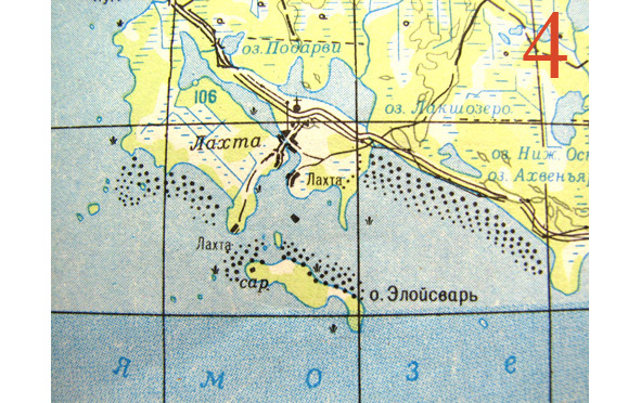 Наличие мелей, подводных и торчащих из воды камней, полей водных растений (как правило, тростниково-камышовых зарослей) показывается с помощью специальных условных обозначений, которые, к сожалению, далеко не всегда приводятся в перечне. Обычно мели (чаще каменистые) обозначаются рядами черных точек разной величины, размер которых уменьшается с глубиной (фото 4).