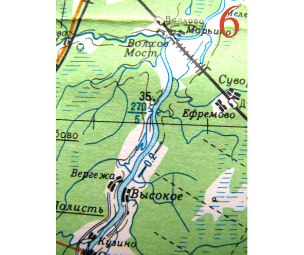 Река в раскладе. Увидеть изобаты на изображении рек не удастся – их просто нет. Им нет места, ведь реки на картах выглядят тонкой синей ниточкой или ленточкой в зависимости от ширины. Поэтому прочитать глубину отдельных участков реки невозможно. Правда, на некоторых крупномасштабных картах встречаются указатели средних значений ширины, глубины и скорости течения, но только для отдельных (избранных) сечений русла. На фото 6, например, указаны ширина реки 270 м, глубина 5 м, направление и скорость течения 0,2 м/с.