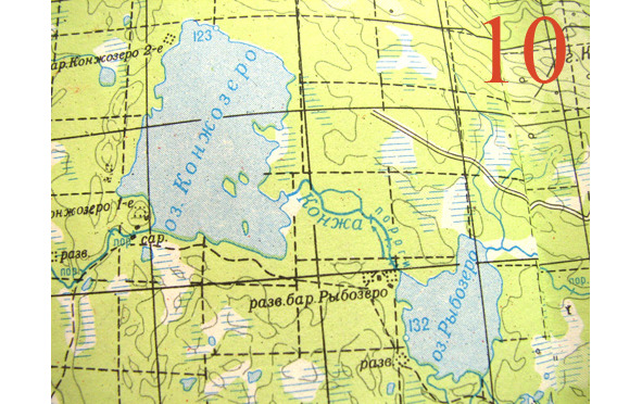 В качестве примера возьмем небольшой фрагмент карты одного из районов Карелии (фото 10). Уровень уреза воды на оз. Рыбозеро – 132 м, а на оз. Конжозеро – 123 м. Перепад высот между озерами 132—123=9 м. Река Конжо, соединяющая оба озера, имеет длину около 5 км (оценка по карте). Следовательно, среднее падение реки составляет 9:5=1,8 м/км – довольно серьезный уклон. Но, судя по карте, этот уклон в основном приходится на порожистую часть реки, т.е. около половины ее длины. Остальная часть может представлять собой и длинные плесы, и мелководные шиверы с более низкой скоростью течения воды. Более точную оценку скорости сделать по карте невозможно. Да и нужно ли это рыболову?