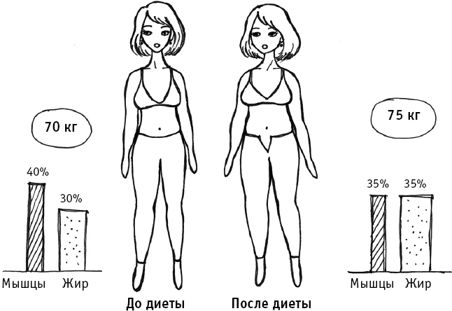 Жир увеличивается, а мышечная масса уменьшается, потому что организм начинает ее использовать как источник недостающих питательных веществ.