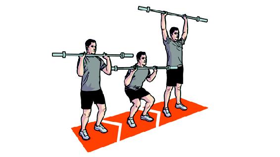 Еще одно полезное упражнение представляет собой сочетание медленно вперед с штангой, переднее приседание и толчок, Переднее Приседание Толкни-Пресс.