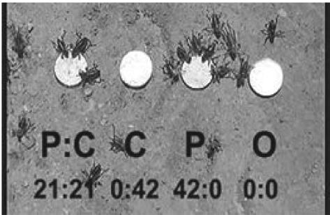 Рис. 1.1. Мормонские сверчки в поисках белка. Крайняя чашка слева (P: C) содержит 21 % протеина и 21 % углеводов (остальное – балластные вещества, витамины и соль). В чашке C только углеводы, P – только протеины (по 42 % в каждой), содержимое чашки O – только балластные вещества, витамины и соль[24].