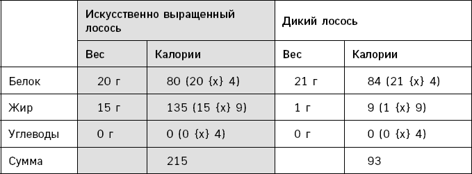 Рис. 1.2. Искусственно выращенный и дикий лосось содержат примерно равное количество белков, но выращиваемый лосось гораздо более жирный и, следовательно, относительно своих калорий дает меньше белков. Можно сказать, что лосось с рыбной фермы содержит разбавленный белок. Данные о пищевой ценности получены от двух филе лосося, купленных в моем супермаркете; вес каждого кусочка составил 100 г.