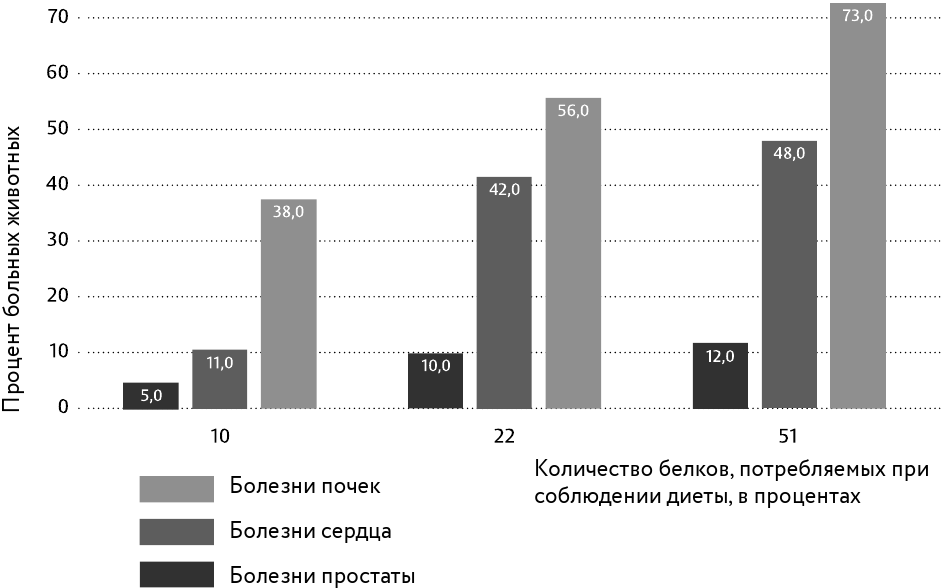 Рис. 2.1. Чем выше содержание белков в рационе, тем чаще у крыс наблюдаются различные заболевания[52].