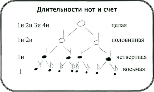 • восьмая = 2 шестнадцатые и т. д.