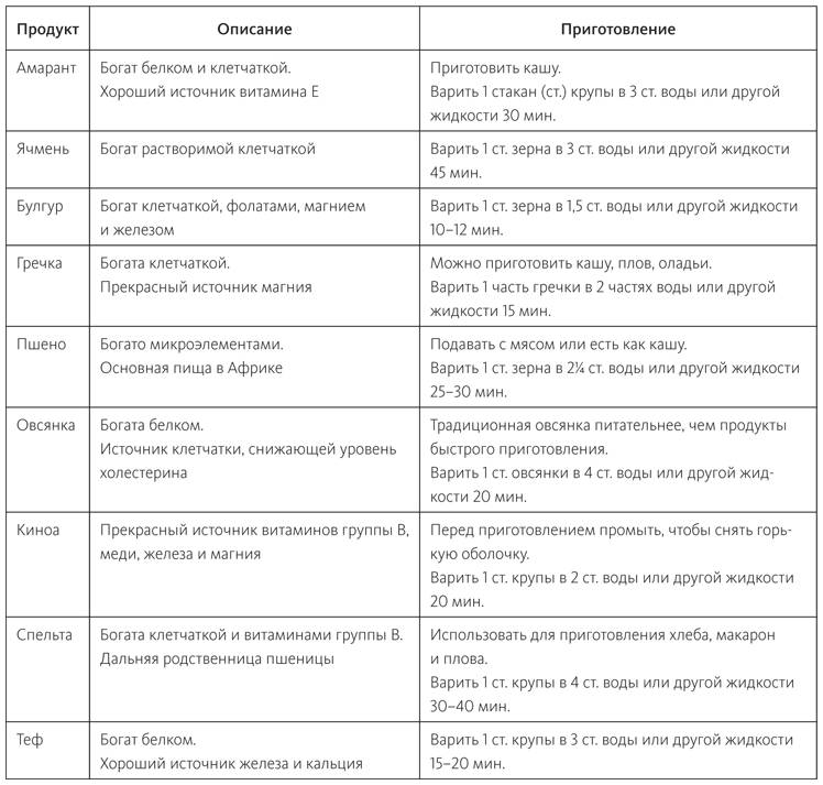 Спортсмены, уставшие от одних и тех же злаков – в основном пшеницы и риса, – могут рассмотреть ряд интересных цельнозерновых альтернатив, в том числе амарант, гречку, киноа, спельту и теф[7] (табл. 2.2). Их надо варить чуть дольше, чем макароны, рис и картофель, однако они питательны и разнообразят рацион. Поэкспериментируйте с приправами, чтобы злаки были не только полезными, но и вкусными.