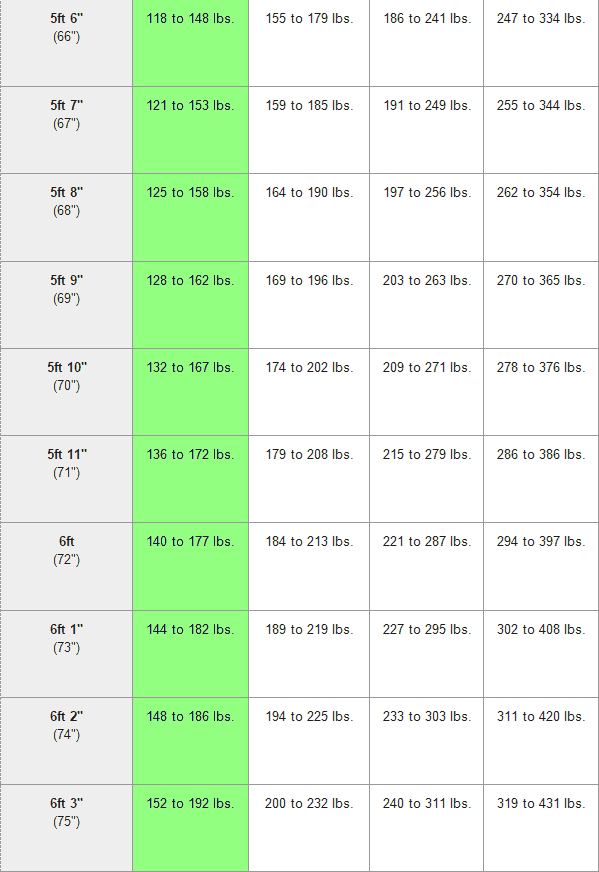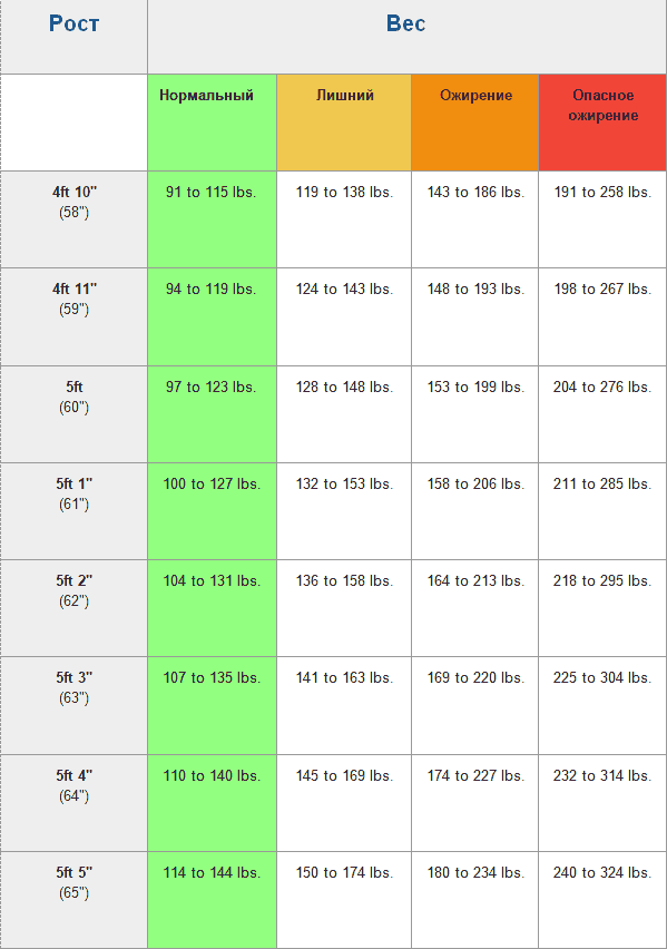 Далее полученный показатель нужно сверить с таблицей. (в таблице приведены цифры в дюймах и фунтах, чтобы перевести в килограммы, умножьте фунты на 0,453592, а дюймы – на 0,0254 или можете воспользоваться онлайн калькулятором)