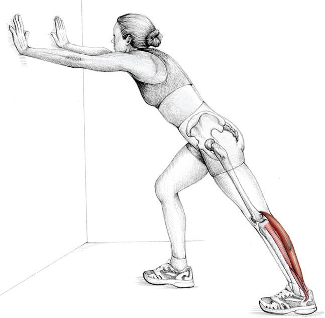 Классический пример того, каким образом можно использовать изометрический стретчинг, – растяжка икроножных мышц «толкание стены» (см. главу 12, растяжка J06). Исходное положение: туловище выпрямлено; необходимо наклониться и опереться о стену, а затем отодвинуть одну ногу как можно дальше от стены, пока не возникнет ощущение дискомфорта, чтобы при этом пятка оставалась на полу. В этом положении у участника сокращается икроножная мышца, как если бы он пытался толкать стену.
