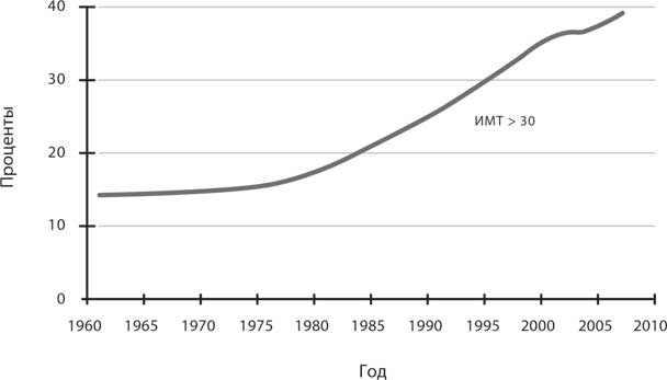 Рис. 1.2. Рост ожирения и экстремального ожирения в Соединенных Штатах Америки среди взрослого населения с 20 до 74 лет