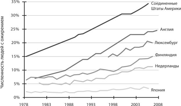 Можно было ожидать, что на фоне всеобщей любви к спорту процент людей, страдающих ожирением, начнет снижаться. Правительства разных стран вкладывали миллионы в развитие и популяризацию физической культуры как средства эффективного похудения, и они действительно заставили своих граждан больше двигаться. В Соединенном Королевстве с 1997 по 2008 годы постоянно увеличивалась интенсивность физических нагрузок. Так, мужчины увеличили количество тренировок с 32 до 39 %, а женщины – с 21 до 29 % (1).
