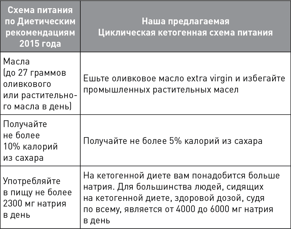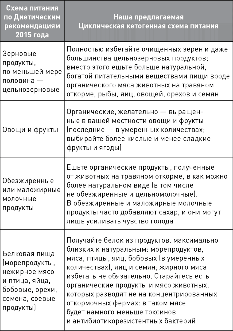 Циклическая кетогенная диета начинается с исходной фазы – развития метаболической гибкости с помощью низкоуглеводной, низкобелковой и высокожировой диеты до тех пор, пока ваш организм не начнет сжигать кетоны (эта фаза длится от двух до восьми недель). После того как вы добьетесь метаболической гибкости и ваш организм сможет сжигать жир в качестве полезного топлива, то два-три дня в неделю вы сможете добавлять к жирам полезные углеводы и более высокую дозу белков – лучше всего это делать в дни силовых тренировок. В таблице 1.1 приводится сравнение Диетологических рекомендаций 2015 года и нашей предлагаемой альтернативы, основанное на данных, изложенных в этой главе.