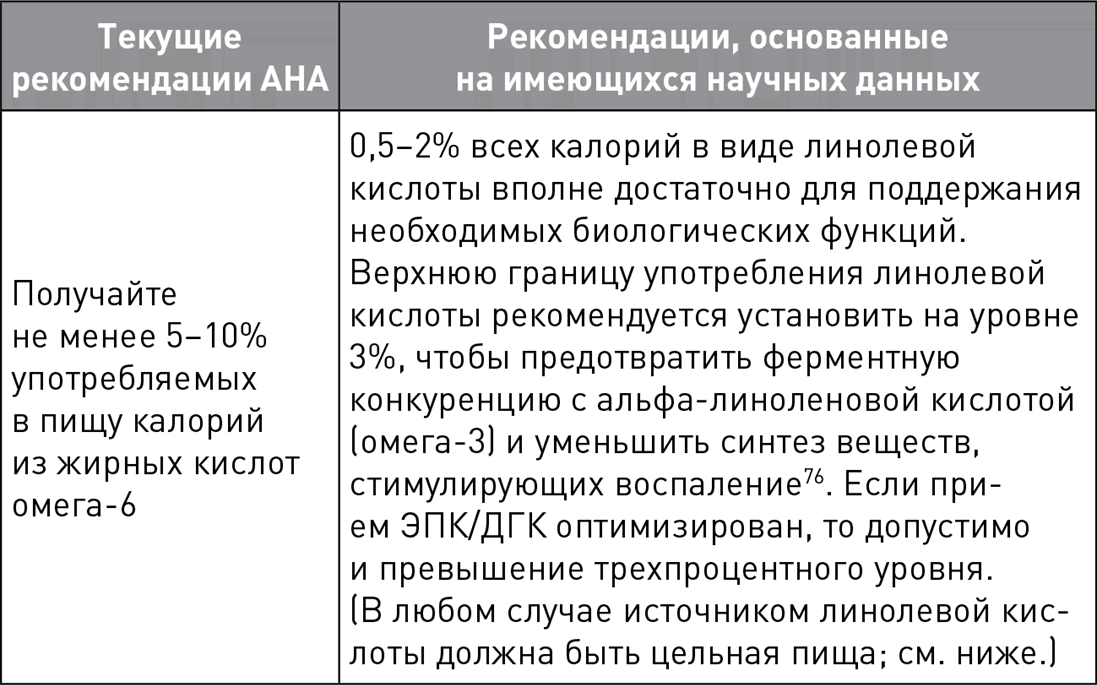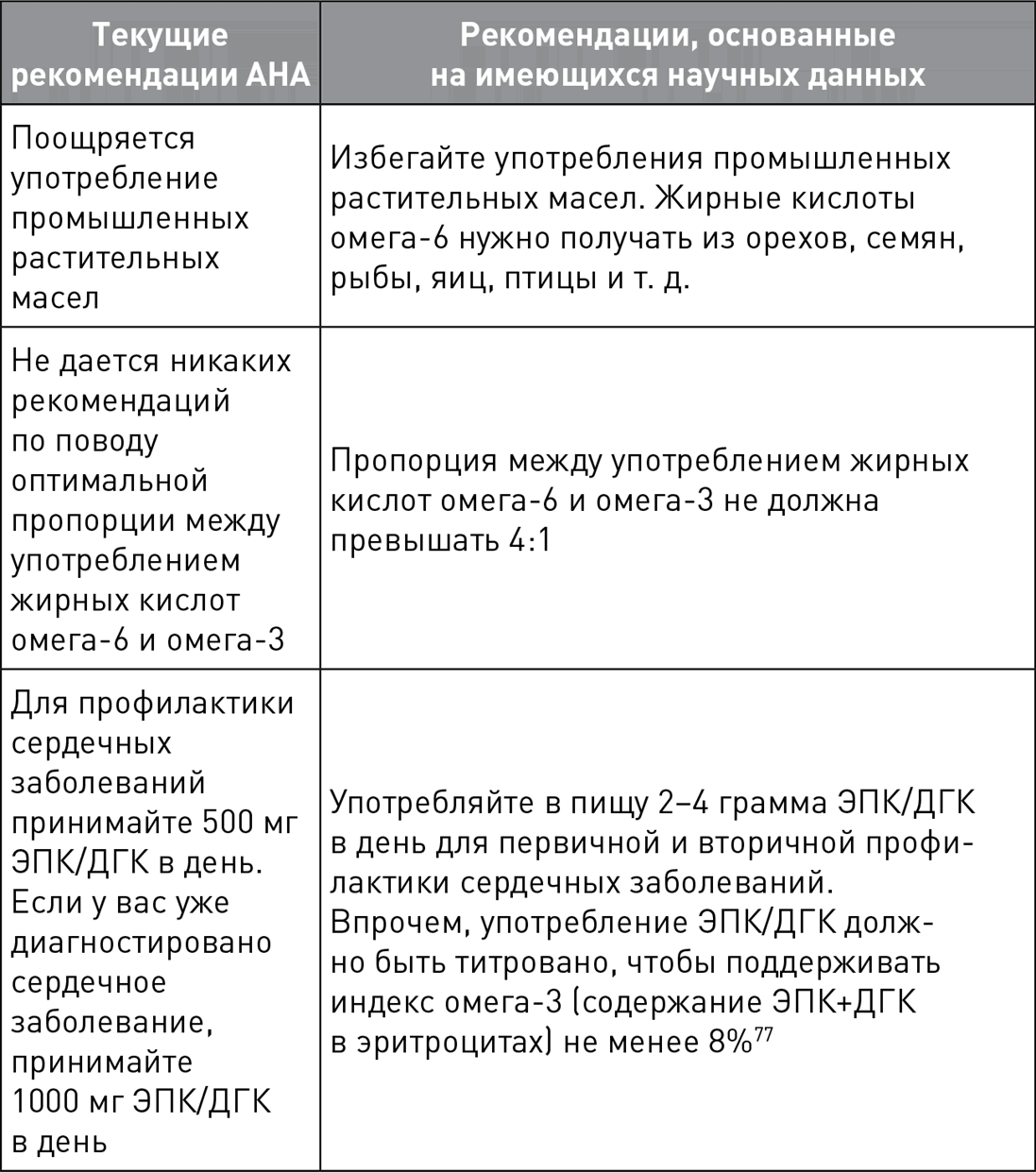 Как показывают данные из Японии, даже если в обычном рационе жирных кислот омега-3 уже много, дополнительные дозы кислот омега-3 все равно приводят к снижению тяжелых коронарных событий. Если это действительно так, то нынешняя рекомендация AHA (500–1000 мг эйкозапентаеновой/докозагексаеновой кислоты) для профилактики коронарных событий, скорее всего, недостаточно высока, чтобы обеспечить оптимальную защиту сердечно-сосудистой системы, особенно учитывая, насколько высока доля жирных кислот омега-6 в рационе американцев. Более уместной была бы рекомендация употреблять в пищу не менее 2–4 граммов ЭПК/ДГК в день, особенно людям с высоким риском коронарной недостаточности и тем, кто уже ею больны75. В таблице 1.2 приведены нынешние рекомендации AHA по жирным кислотам омега-6 и омега-3 и рекомендации, которые более соответствуют современным научным данным.
