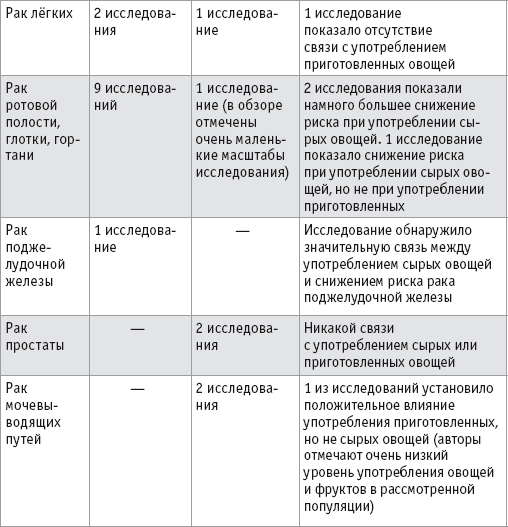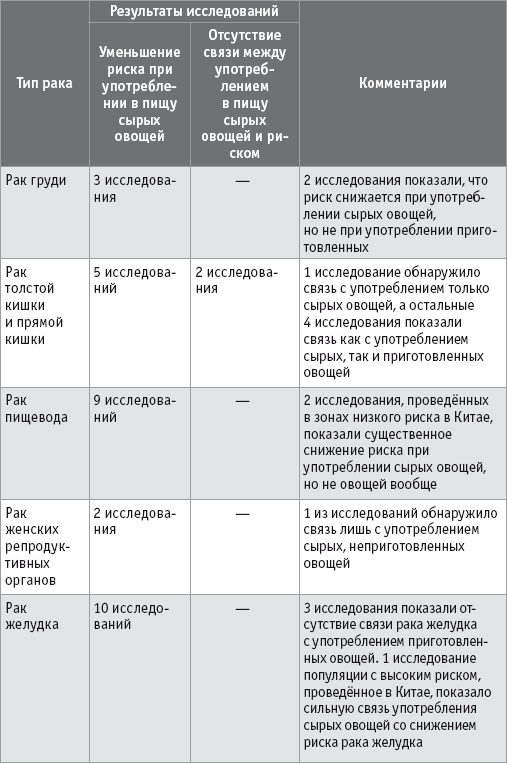 Три обзора научных публикаций показали более значительное преимущество употребления в пищу сырых овощей по сравнению с приготовленными овощами53–55. Обзор 2004 года, проведённый Линком и Поттером из Колумбийского университета в Нью-Йорке, а также Центром исследований рака Фреда Хатчинсона в Сиэтле, рассматривал исследования, опубликованные между 1994 и 2003 годами и изучавшие употребление овощей в связи с риском возникновения различных видов рака. Результаты этих исследований сведены в таблицу 3.1 на с. 58. Авторы выдвигают несколько причин, по которым сырые овощи более эффективно защищают от рака по сравнению с приготовленными овощами:
