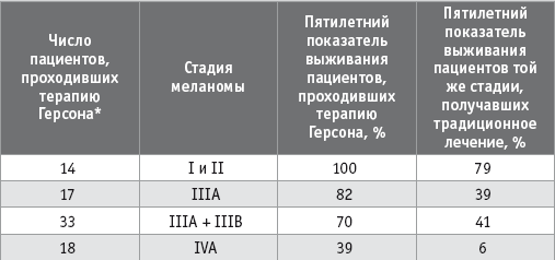 * Число пациентов, проходивших терапию Герсона, слишком мало для получения статистически значимых данных. Число пациентов, проходивших традиционную терапию, намного выше.