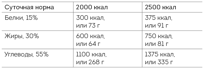 Перевести калорийность в граммы легко, зная, что в каждом грамме углеводов и белков – по 4,1 ккал, а в 1 грамме жира – 9,3 ккал. Соответственно, если ваша дневная норма составляет 2000 ккал, то рекомендуемая доля в 55 % углеводов соответствует 1100 ккал, или 1100/4,1 = 268 г углеводов в сутки.