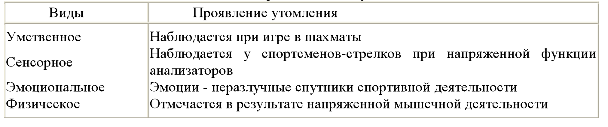 Существуют многочисленные попытки классифицировать утомление. Так, различают четыре основных вида утомления (табл. 1).