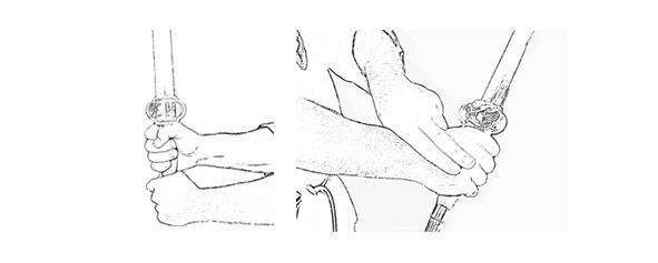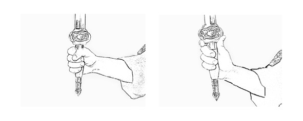 Различают прямой и обратный хват меча. При прямом хвате все пять пальцев кисти плотно сжаты в кулак. Такой хват применяется для рубящих и режущих ударов. Существует вариант для нанесения колющих ударов, когда большой и указательный пальцы упираются в гарду меча. Обратный хват также подразделяется на два варианта. Для рубящих и режущих ударов рукоятка меча плотно удерживается всеми пальцами кисти. Для уколов основанием рукоятки (цзяньтан) указательный и большой пальцы вытянуты вперед. Указательный палец плотно упирается в цзяньтан.