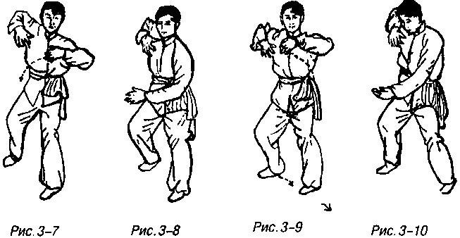 Из позиций для атаки швыряемой ладонью (рис. 3-9) правая нога толкает землю, левая нога продвигается влево-вперед, совершается уход корпусом, правая нога естественно подшагивает на полшага, одновременно левая ладонь сверху через левую сторону идет по дуге вниз и вправо перед животом, центр ладони обращается вверх (рис. 3-10).