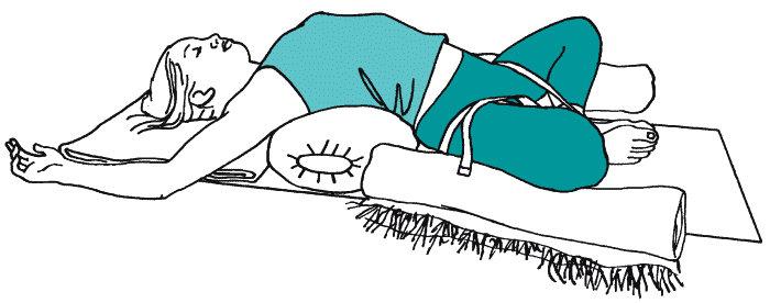 Во время беременности позу связанного угла рекомендуется практиковать до тех пор, пока вы чувствуете себя комфортно, лежа на болстере. (На более поздних сроках вам, возможно, понадобится увеличить высоту опоры – положить дополнительный болстер или облокотиться на стул.)