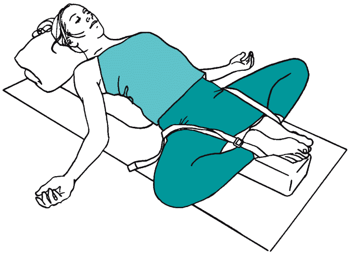 Зафиксируйте положение стоп ремнем: сделайте из него широкую петлю, оденьте ее через плечи на область крестца (не на талию или поясницу) и пропустите по внутренней поверхности бедер, поверх лодыжек и под стопами. Подтяните стопы максимально близко к промежности и затяните ремень. Позвольте бедрам раскрыться, а коленям – опуститься в стороны. При тугоподвижности тазобедренных суставов и болезненном напряжении в паху подложите под колени скрученные одеяла – это расслабит мышцы бедер и таза.