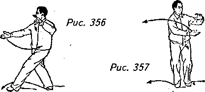 Движение 5: Разведите руки в стороны приблизительно на ширину плеч, держа кисти внутренней стороной вниз. Отклоните верхнюю часть корпуса назад и перенесите вес своего тела на правую ногу, отрывая кончики пальцев левой ноги от земли. Одновременно с этим разведите руки по обе стороны груди, держа кисти внутренней стороной под углом от себя. Взгляд теперь устремлен вперед (рис. 364, 365).