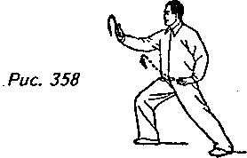 Движение 2: Правой ногой шагните вправо и перенесите на неё тяжесть своего тела, переходя на правый “шаг вдоль кромки радуги”. Одновременно с этим правую руку переведите вправо и вверх до уровня плеча, ладонью внутрь, как бы отбивая атаку. А левую руку опустите к левому бедру ладонью вниз. Взгляд должен быть обращен к правому запястью (рис. 358).