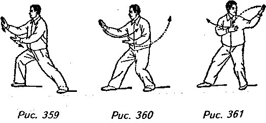 Движение 3: Выставив правую руку вперед ладонью вниз, переместите левую руку ладонью вверх перед животом непосредственно к правому запястью. Затем отведите обе руки назад, вниз и вперед по окружности до тех пор, пока левая рука, направленная ладонью вверх, не достигнет уровня плеч, а правая, обращенная ладонью к внутренней стороне, не окажется перед грудью. Одновременно с этим медленно переместите центр тяжести своего тела на левую ногу (рис. 359, 360, 361).