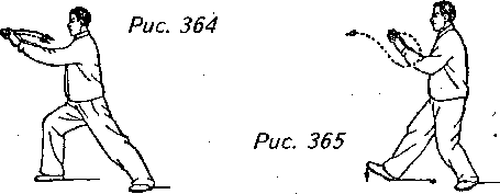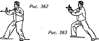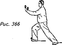 Движение 4: Отведите левую руку немного назад к внутренней стороне правого локтя, затем обеими руками Надавите вперед, правой ладонью к себе, а левой от себя. В этот момент медленно перенесите центр тяжести тела на правую ногу, переходя на левый “шаг вдоль кромки радуги”. Взгляд следует обратить на локоть правой руки (рис. 362, 363).