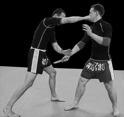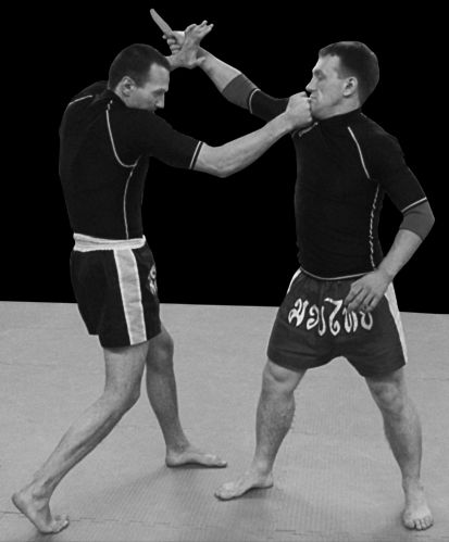 В реальной схватке хорошо владеющий ножом человек, скорее всего, будет в первую очередь стараться поранить ваши руки и ноги, а уже потом будет бить в корпус. Если на улице ваш противник достал нож, необходимо сразу же разорвать дистанцию, чтобы не дать ему провести внезапный удар. Не стоит атаковать противника, вооруженного ножом, первым. Если он умеет пользоваться своим оружием, то он легко порежет атакующие конечности, а после проведет атаку в корпус. Работать против ножа следует на контратаках, постоянно смещаясь и кружа вокруг противника, проводя удары одновременно с блоками или во время контролирующего контакта с вооруженной рукой противника. Контратаки должны быть направлены в самые уязвимые места на теле противника: это глаза, челюсть, горло, пах и колени. Опытный ножевик может обогнуть ваш блок и нанести удар в корпус, попутно обрезав вашу руку, поэтому блок должен быть мягким и больше ориентированным на перевод и контроль вооруженной кисти противника. Если есть возможность, необходимо постараться обернуть предплечье левой руки какой-либо одеждой или тканью и блокировать удары ножа ею, а контратаки наносить правой рукой и ногами, выжидая момент для перехвата вооруженной руки противника. Еще раз хочу заметить, что, если противник вооружен ножом, лучше всего будет либо вооружиться хоть чем-то, либо избежать схватки вообще. Но уж если вас вынудят принять подобный неравный бой, необходимо действовать максимально обдуманно, быстро и жестко, чтобы попытаться вывести нападающего из строя, и дай вам бог удачи, потому что она вам очень понадобится.