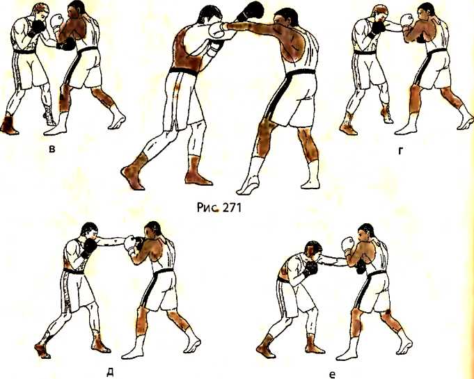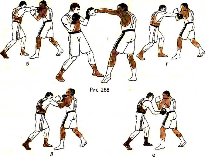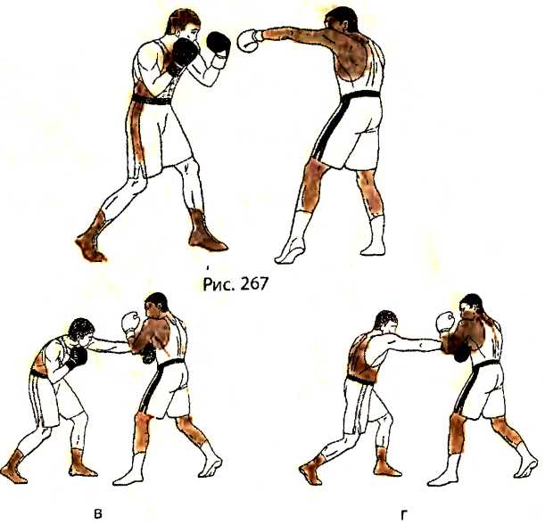 в ) отталкиваемся правой ногой и наносим ответный прямой удар левой рукой в туловище противника;