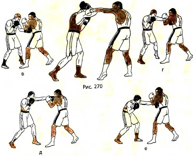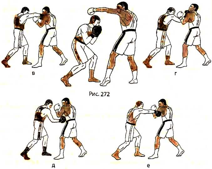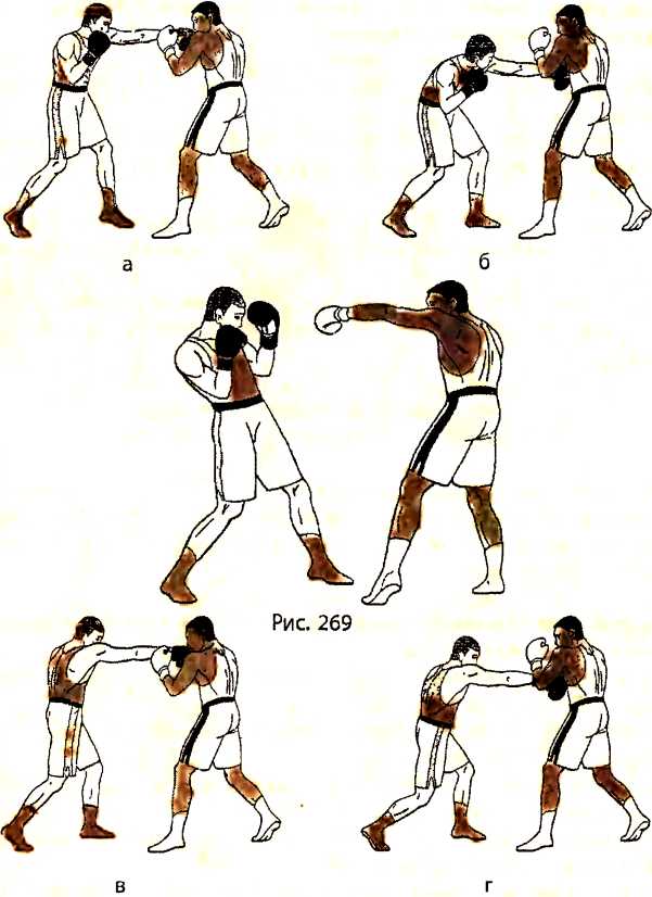 В ответ на боковой удар левой рукой в голову со стороны противника, отталкиваемся левой ногой и, отклоняясь туловищем назад, делаем шаг правой ногой назад (рис. 269 - вид справа ). Как только правая нога получает опору, тут же подтягиваем к ней левую ногу.