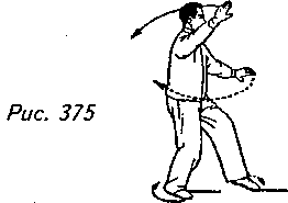 Движение (продолжает рис. 374): Отступите назад правой ногой на полную ступню и весь свой вес перенесите на нее, одновременно отводя левую ногу на пару дюймов (около 5 см) и касаясь земли носком, делая левую ногу "опустошенной”. Выполнив эту часть упражнения, разожмите оба кулака и разведите руки в разные стороны: правой опишите окружность от себя и вверх до правого бока перед грудью (вывернув ладонь наружу), а левую опустите по кривой, чтобы она оказалась слева от бедра с ладонью, обращенной под углом в сторону. Взгляд при этом должен быть направлен вперед (рис. 375).