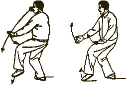 Подтянув правую ногу на полшага к левой, перенести вес тела на правую ногу. Левая нога при этом отрывается от пола. Одновременно правая рука двигается вниз, а затем вверх на себя к правому уху. Ладонь у уха обращена к себе. Левая кисть совершает круговое движение вперед и вниз. Корпус при этом разворачивается вправо в направлении 4 часов. Далее опустить левую стопу носком на пол. (Выполняется левая “пустая” позиция). Одновременно правая кисть совершает движение по дуге вниз пальцами вперед, а левая отходит к левому бедру ладонью вниз. Корпус при этом разворачивается влево в направлении 3 часов. Смотреть в пол (рис. 150–151).