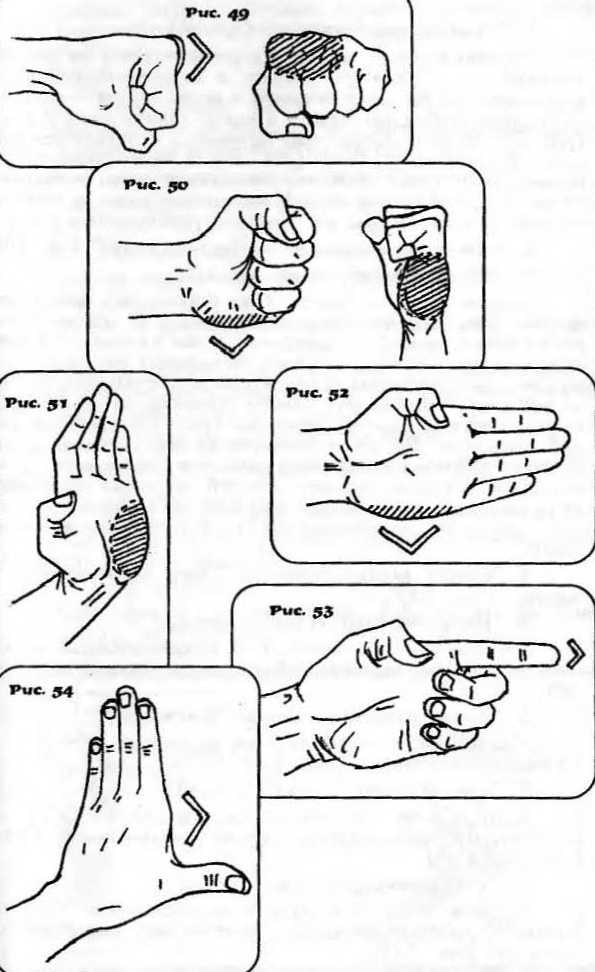 Для нанесения ударов используются только самые надежные и безопасные для использующего части тела. Использование нескольких ударных частей кисти объясняется необходимостью наилучшего поражения различных целей и возможностью использования одних ударных частей, когда повреждены другие.