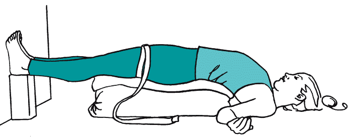 Чтобы выйти из асаны, согните ноги в коленях и поставьте стопы на пол по бокам от болстера. Приподнимите таз и соскользните с опоры назад, затем опустите таз на пол и снимите с бедер ремень. Скрестите ноги и положите их на болстер – пусть поясница мягко опустится на пол. Полежите так несколько минут, после чего повернитесь на правый бок и, опираясь на левую руку, медленно сядьте (голова поднимается в последнюю очередь).