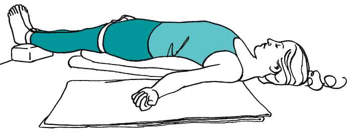 Разместите по центру коврика два сложенных в ширину одеяла – одно на другое. Положите к стене блок на одной линии со стопкой одеял. Сядьте на край одеял и зафиксируйте бедра и щиколотки ремнем. Отклонитесь назад и опустите спину на опору так, чтобы верхушки плеч и затылок лежали на полу; стопы поставьте на блок. Помогая себе руками, выровняйте положение головы, чтобы она не отклонялась в сторону и лежала на центре затылка. Руки сложите на животе. Когда будете готовы идти дальше (через 2–3 недели после операции на груди), положите руки на тонкие одеяла по обеим сторонам от корпуса, развернув их внутренней стороной вверх, ладонями к потолку.