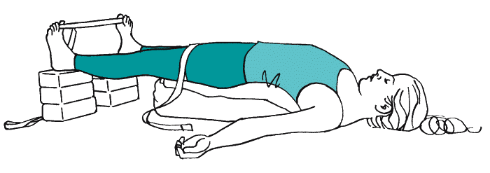 Разместите на полу болстер, на расстоянии примерно полуметра от стены. Не стелите коврик, так как он будет мешать соскальзывать с болстера. Если у вас длинный позвоночник или слишком плоский болстер, поместите на опору сложенное одеяло. Поставьте у стены блок, узким ребром вверх на одной линии с болстером. Сядьте на край болстера лицом к стене. Заверните передние мышцы бедер внутрь и зафиксируйте их ремнем – это поможет расслабить нижнюю область живота. Отклонитесь назад и уложите корпус на болстер так, чтобы верхушки плеч и затылок лежали на полу. Поставьте пятки на блок, а подошвы стоп – на стену. Если у вас согнуты колени, возьмитесь за края болстера, оттолкнитесь стопами от стены и «отъедьте» немного дальше, чтобы полностью выпрямить ноги. Круговым движением подверните под себя плечи.