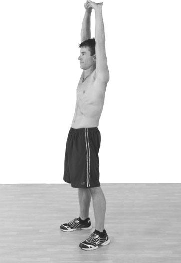 1. Станьте прямо, ноги на ширине плеч, вытяните замкнутые в локтях руки над головой, переплетите пальцы в замок и поверните кисти ладонями вверх.